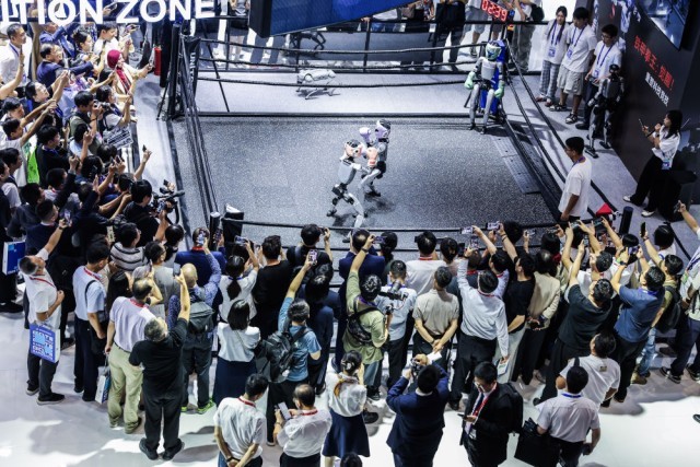 2025年9月25日,在第四届全球数字贸易博览会数智未来主题展区的杭州六小龙专区,观众观看宇树科技的人形机器人进行格斗擂台赛。新华社记者 徐昱 摄