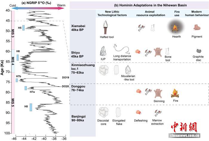 东沟遗址研究论文第一作者、中国科学院古脊椎所博士研究生徐静玥介绍说,光释光测年为遗址搭建高分辨率的年代框架,显示东沟古人类的主要活动时间为距今7.6万-7.4万年,处于温暖的MIS5阶段向以严寒著称的MIS4阶段的转型期。