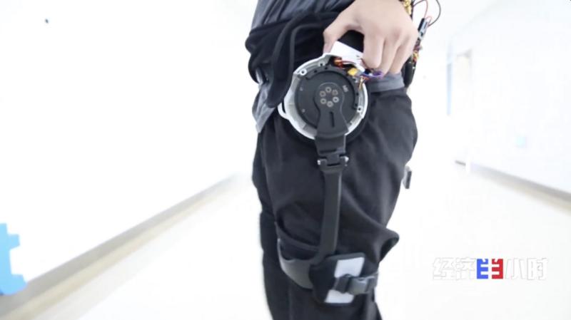 除了这款框架式外骨骼机器人,还有一款便携式的“机器外挂”。今年87岁的李桂英老人穿上它以后,可以丢掉拐杖,进行散步锻炼。